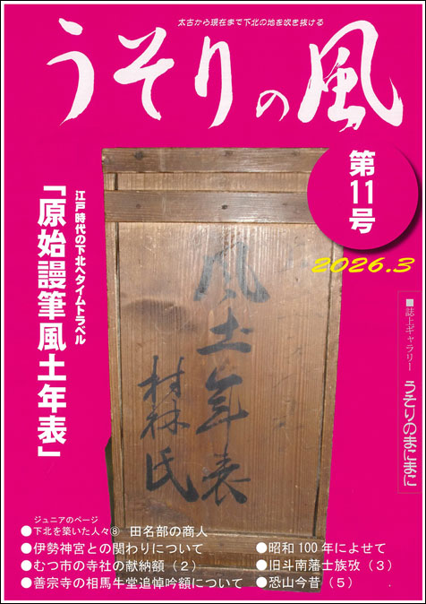 うそりの風 第11号 江戸時代の下北へタイムトラベル 「原始謾筆風土年表」 ・ジュニアのページ 下北を築いた人々⑧ ・伊勢神宮との関りについて ・昭和100年によせて ・むつ市の寺社の献納額(2) ・旧斗南藩士族攷(3) ・恐山今昔(5) 発行日:2026年3月25日 編集・発行:うそりの風の会